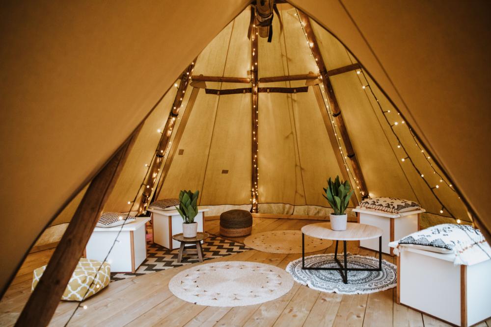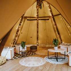 Dovecote Events' very own giant tipi makes the most inspired setting where you really can create an event like no other. Being one of only a small amount in the country, our exclusive tipi can accommodate either 120 for a formally seated event or up to 200 for something a little more relaxed. Complete with a wooden walkway, wooden flooring throughout, oak doors, outside shelters, fire pits, a bar, toilets, a chillout room, beautiful views and sprinkled with magical lighting inside and out, your tipi event will be something you and your guests will never forget.